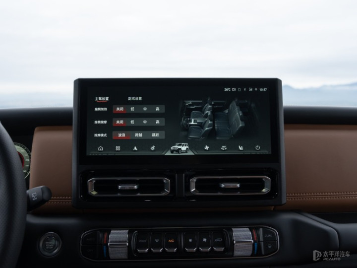 在舒适配置方面,新车标配方向盘加热;座椅通风(“坐垫吹风、靠背吸风”,35℃环境下快速降温3-5℃)。更有厉害的是,一款主打越野产品竟然支持四向腰托(2个独立气袋,单独充放气,最高支撑力36kg,腰托力54Kpa,行程36mm,精准贴合腰椎)和6点气袋式座椅按摩。