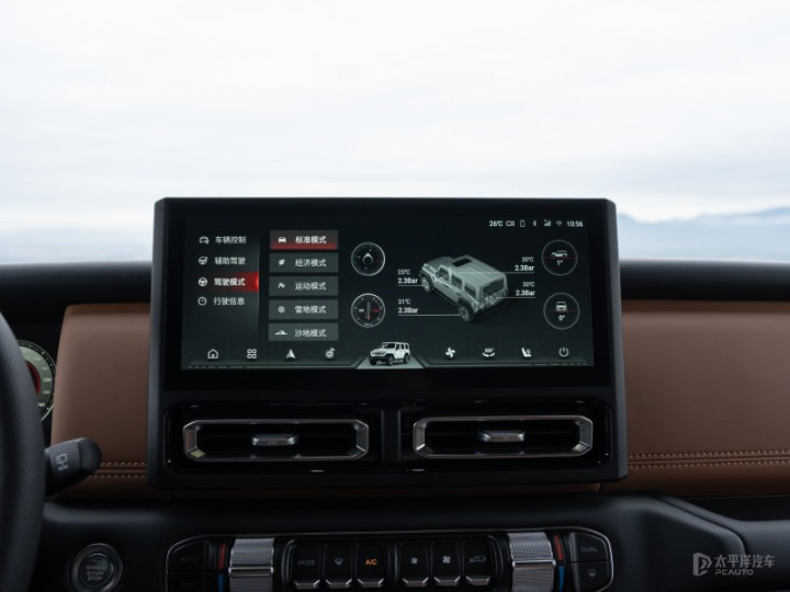 T01检阅官配备了东安动力2.0T发动机,最大扭矩410牛·米;标配前后桥差速锁,从容应对泥地、雪地、交叉轴等越野场景,具备更稳定的脱困能力;同时配备了可手动切换的分时四驱,低速四驱下可放大2.5倍扭矩,放大牵引力,适合极端越野或重度爬坡。