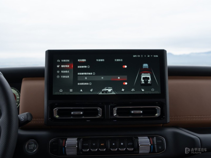 车内配备全液晶仪表盘和悬浮式中控屏,其中仪表盘能显示车辆的倾角、方位方向等。同时还搭载辅助驾驶功能,支持车道保持、前向碰撞预警等。